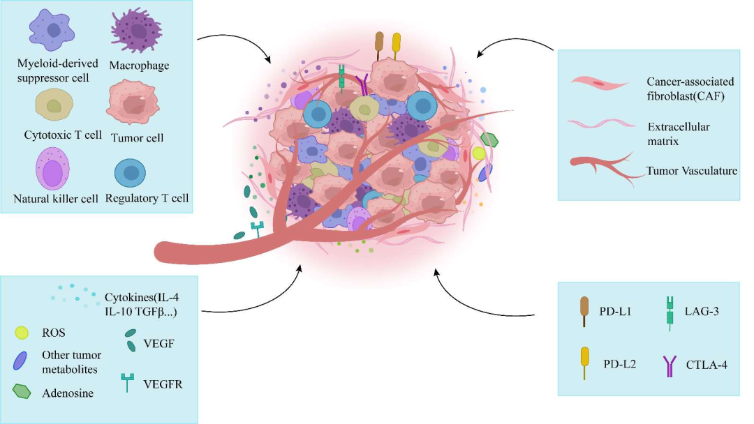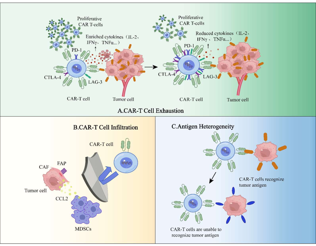 1.复杂的肿瘤微环境:肿瘤内部充斥着肿瘤相关巨噬细胞(TAM)、调节性T细胞(Treg)、髓源性抑制细胞(MDSC) 等“敌对势力”。它们分泌TGF-β、IL-10等抑制因子,极力压制CAR-T细胞的活性; 图2. 肿瘤微环境 2.CAR-T细胞耗竭:在肿瘤内部持续不断的抗原刺激下,CAR-T细胞像“过度加班”的工人,变得疲惫不堪,高表达PD-1、TIM-3等抑制性受体,功能严重衰退; 3.浸润障碍:实体瘤组织致密,有异常的血管系统和大量的细胞外基质(ECM) 形成的物理屏障,CAR-T细胞难以穿透并抵达战场核心; 4.抗原异质性:肿瘤细胞非常“狡猾”,会通过抗原丢失或下调来“伪装”自己,使得只识别单一抗原的CAR-T细胞失去目标,导致免疫逃逸和肿瘤复发。 图3. CAR-T细胞的耗竭、浸润及抗原异质性