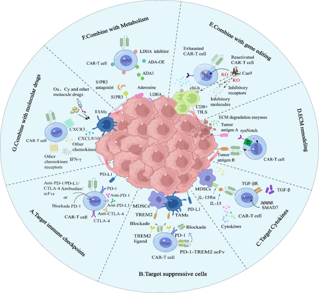 1.联合免疫检查点抑制剂:将CAR-T与抗PD-1/PD-L1抗体联用,或直接让CAR-T细胞分泌抗PD-1的scFv抗体,打破其身上的“枷锁”,重焕活力; 2.靶向免疫抑制细胞:设计能识别TAM或CAF表面标记的CAR-T,“清除”这些帮凶,为CAR-T主力部队扫清障碍; 3.细胞因子工程化:让CAR-T细胞自产自销IL-15、IL-18等细胞因子,这些“兴奋剂”能显著增强其存活、增殖和杀伤能力,并抵抗微环境的抑制; 4.ECM重塑:通过synNotch系统,让CAR-T细胞在识别肿瘤后,就地分泌透明质酸酶等基质降解酶,直接“溶解”物理屏障,打通浸润通道; 5.基因编辑:利用CRISPR-Cas9技术,直接敲除CAR-T细胞内部的PD-1、TIGIT等耗竭相关基因,或敲除TGF-β 受体,使其对抑制信号“无动于衷”,成为更坚韧的“超级战士”; 6.代谢调控:实体瘤内部缺氧、高乳酸、高腺苷。通过改造,让CAR-T细胞高表达腺苷脱氨酶,将抑制性的腺苷转化为无害的肌苷;或使其在缺氧环境下才被充分激活,从而适应恶劣的肿瘤代谢环境; 7.联合分子药物: 化疗药物(如环磷酰胺):作为预处理方案,可清除体内的免疫抑制细胞,为CAR-T腾出空间; STING激动剂:可促进肿瘤部位趋化因子分泌,吸引更多CAR-T细胞浸润。 图4. CAR-T细胞治疗实体肿瘤的zui新突破
