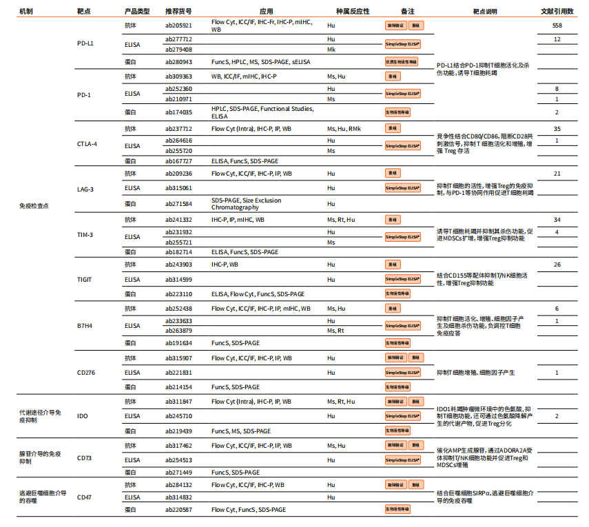 在CAR-T细胞研发、免疫细胞功能验证、肿瘤免疫机制研究等场景中,抗体的特异性、批次一致性、功能可靠性直接决定实验数据的准确性与可重复性。传统多克隆抗体或普通单克隆抗体易出现交叉反应、批次差异大、效价不稳定等问题,而Abcam重组抗体凭借前沿技术赋能,从设计到生产全流程把控,成为全球科研团队的“信赖之选”! 01 核心技术亮点:重新定义抗体品质标准 Abcam重组抗体基于基因工程精准构建,告别传统杂交瘤技术的局限性,每一款都经过多维度验证,核心优势直击科研痛点: 02 核心技术亮点:重新定义抗体品质标准 Abcam重组抗体凭借精准的靶点识别与稳定的性能,已成为以下科研方向的“标配工具”: CAR-T、NK细胞疗法研发:CD3、CD19、BCMA、CD20等靶点抗体,用于CAR分子设计、表达验证及细胞分选纯化; 免疫细胞功能研究:PD-1、PD-L1、CTLA-4、IL-2、IFN-γ 等抗体,助力T细胞、NK细胞活化与功能机制探索; 肿瘤免疫机制解析:肿瘤标志物(如 HER2、PD-L1)、免疫检查点分子抗体,适配肿瘤微环境免疫细胞分型与信号通路研究; 诊断试剂开发:高特异性抗体原料,支持流式细胞仪检测试剂、免疫组化试剂盒等产品研发。 03 肿瘤免疫逃逸研究相关的Abcam部分产品