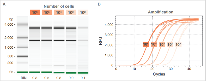 (1)微量样本表现:从 102个到 106个 HEK293 细胞中提取的 RNA,RIN 值保持 9.3-9.9,RT-qPCR 扩增曲线显示稳定定量趋势