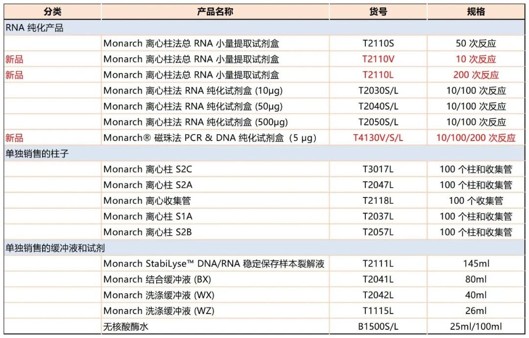 为响应众多用户对大批量 RNA 提取的需求,NEB为经典的 Monarch 离心柱法总 RNA 小量提取试剂盒推出了更大规格的包装。延续其快速、高得率、高纯度的特点,更适合频繁使用 RNA 提取的实验室,助您节省成本、提升效率