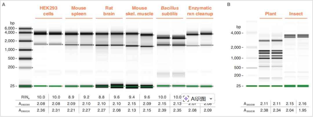 (3)多样本适配:从 HEK293 细胞、小鼠脾脏、大鼠大脑、枯草芽孢杆菌等样本中提取的 RNA,RIN/RINe 值多在 8.8-10 之间,A260/280比值≥2.0