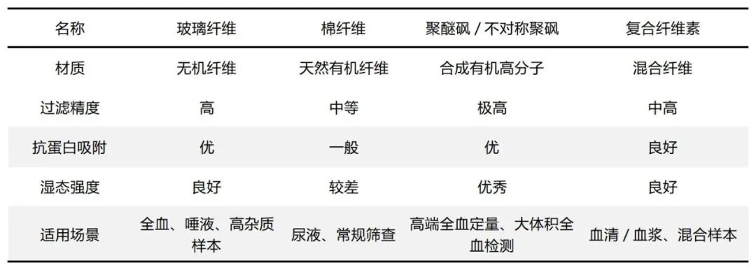 特点:吸水量大,天然亲水无需复杂预处理;成本较低,材质天然温和,与多数样本成分兼容性良好,无额外干扰风险。