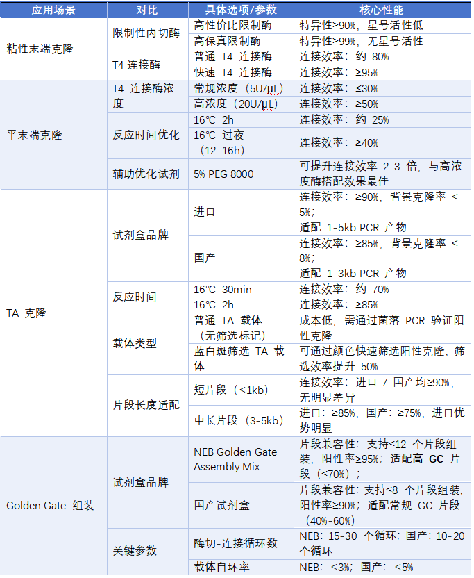 常规实验优先国产试剂控成本,高难度、长片段 、精准构建选进口试剂,高通量 / 批量实验侧重国产性价比,长片段(>5kb)建议避开平末端 / TA 克隆,改用 Golden Gate 或无缝克隆。