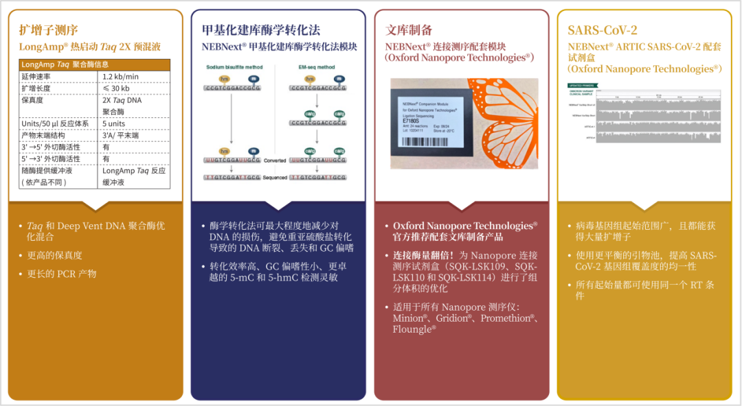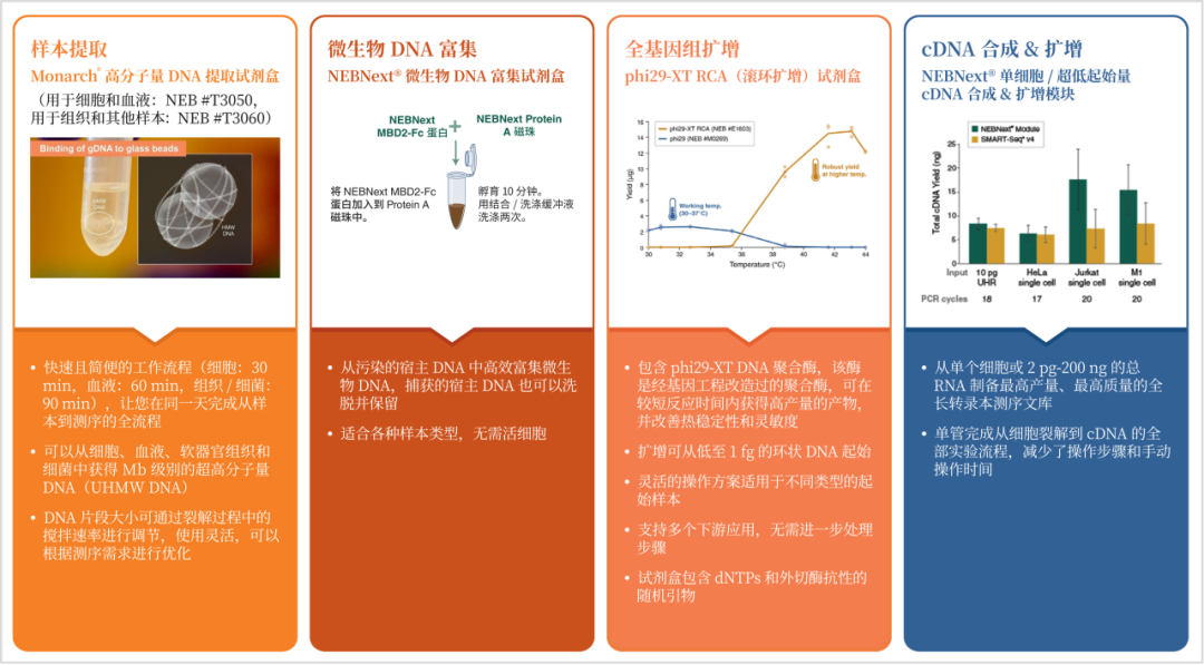 ONT 的 “超长读长、实时输出、直接检测” 三大优势,结合 NEB 高适配性试剂,在五大领域形成成熟应用: 1. 全基因组测序与组装 应用价值:超长读长(可达 1 Mb+)轻松跨越重复序列、端粒 / 着丝粒等复杂区域,实现端粒到端粒(T2T)完整基因组构建。 NEB 产品:Monarch® 系列提取的 UHMW DNA 搭配 E7180 文库模块,确保读长和组装连续性,已广泛应用于人、动植物、微生物的全基因组从头组装。 2. 转录组与表观基因组研究 应用价值:直接 RNA 测序无需 cDNA 转化,保留 RNA 修饰信息;全长 cDNA 测序精准识别转录本异构体,避免短读长拼接误差。 NEB 产品:Induro™等反转录酶保证 cDNA 全长性,甲基化建库模块(E7125)实现 5-mC/5-hmC 精准检测,为基因表达调控机制研究提供可靠数据。 3. 宏基因组与微生物研究 应用价值:无需培养即可快速鉴定复杂微生物群落,解析耐药基因和功能基因,适用于肠道菌群、环境微生物、临床病原检测。 NEB 产品:微生物 DNA 富集试剂盒(E2612)解决宿主污染问题,LongAmp® 热启动 Taq(M0533)适配 16S rRNA 扩增子测序,提升低丰度微生物的检出率。 4. 临床诊断与病毒溯源 NEB 产品:E7660 SARS-CoV-2 配套试剂盒支持病毒基因组快速测序,E7180 文库模块适配 FFPE 样本 DNA 修复,满足临床存档样本的检测需求 应用价值:6-8 小时完成病原微生物检测,实时输出耐药基因信息;肿瘤样本的结构变异和甲基化检测,辅助精准治疗。 5. 特殊样本与低起始量测序 应用价值:单细胞测序、古 DNA、无细胞 DNA(cfDNA)等特殊样本的高灵敏度检测,拓展测序技术的应用边界。 NEB 产品:phi29-XT RCA 试剂盒(E1603)从 1 fg DNA 起始扩增,单细胞 cDNA 模块(E6421)适配超低起始量样本,实现 “微量样本 + 高灵敏度检测” 的组合。