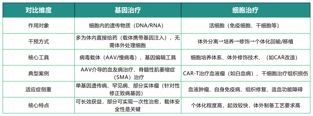 提到CGT(细胞与基因治疗),很多人会下意识将基因治疗和细胞治疗划等号,甚至混为一谈。但事实上,二者虽同属CGT核心赛道,却在干预层面、治疗逻辑、技术路径和适用场景上有着本质区别。 简单来说,一个是“修正基因指令”,让体内原有细胞恢复正常功能;一个是“替换/增强细胞单元”,用体外加工后的合格细胞,替代体内异常细胞。 基因治疗 核心定位:直接干预体内细胞的遗传物质(DNA/RNA),不替换细胞本身,从根源解决“基因序列异常”问题; 技术细节:通过特定载体(临床最常用AAV腺相关病毒、慢病毒),将正常基因导入异常细胞、修正突变的致病基因,或沉默过度表达的异常基因,从而让原本“出错”的细胞,重新获得正常的生理功能。 细胞治疗 核心定位:不对体内原有细胞进行修饰,而是对细胞进行体外分离、培养、加工后,回输至患者体内,实现“细胞替代”或“功能增强”; 技术细节:先从患者自身(自体细胞)或健康供体(异体细胞)中,分离出目标细胞(如免疫细胞、干细胞等),在体外实验室环境中进行培养、扩增,必要时进行基因修饰优化,最终将功能合格的细胞移植回患者体内,发挥治疗作用。 关键维度对比