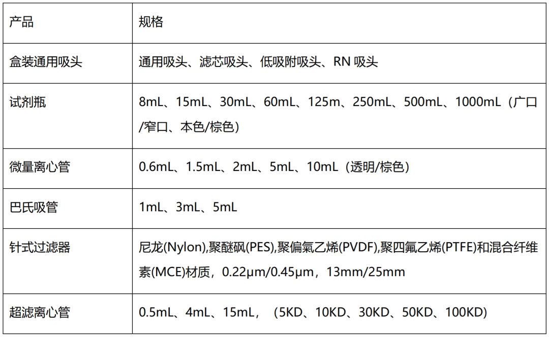 【试用产品】:盒装通用吸头、RN吸头、试剂瓶、微量离心管、巴氏吸管、试剂槽、样品管、针式过滤器、超滤离心管